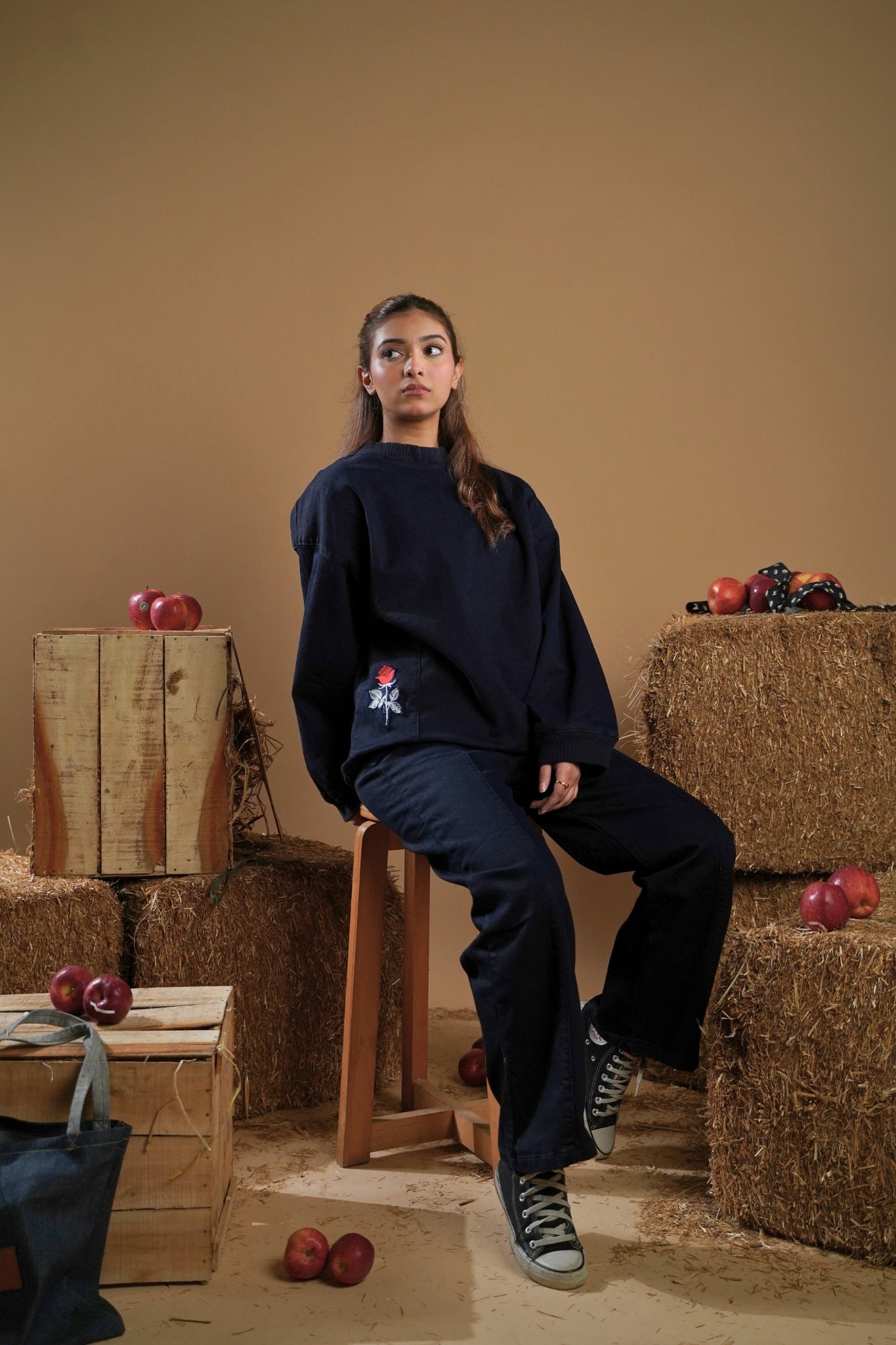 Dark Blue Straight Fit Raised Wool Denim Sweatpants (Unisex)